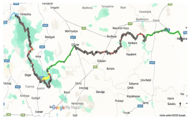 İlimize bağlı İhsaniye İlçesinden geçen güzargah haritası aşağıya çıkarıldı. Kaynak: Afyon Valiliği