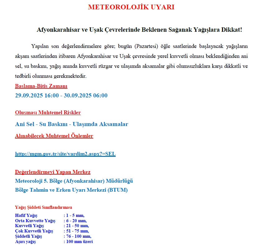 Yapılan son değerlendirmelere göre; bugün (Pazartesi) öğle saatlerinde başlayacak yağışların akşam saatlerinden itibaren Afyonkarahisar ve Uşak çevresinde yerel kuvvetli olması beklendiğinden ani sel, su baskını, yağış anında kuvvetli rüzgar ve ulaşımda aksamalar gibi olumsuzluklara karşı dikkatli ve tedbirli olunması gerekmektedir.