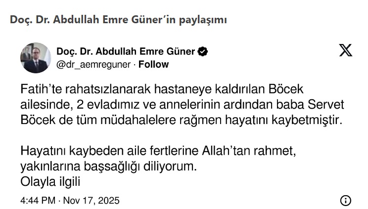 'Fatih’te rahatsızlanarak hastaneye kaldırılan Böcek ailesinde, 2 evladımız ve annelerinin ardından baba Servet Böcek de tüm müdahalelere rağmen hayatını kaybetmiştir.