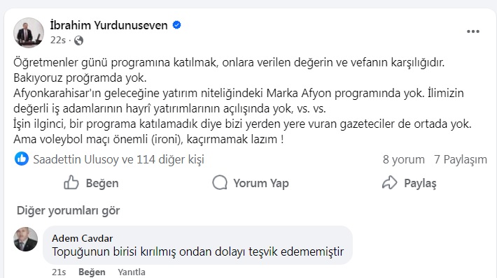 Ama voleybol maçı önemli (ironi), kaçırmamak lazım !" dedi. Yurdunuseven'in yapmış olduğu bu paylaşımda kimden bahsettiği ise, çok sayıda vatandaş tarafından merak konusu oldu. Afyon Time