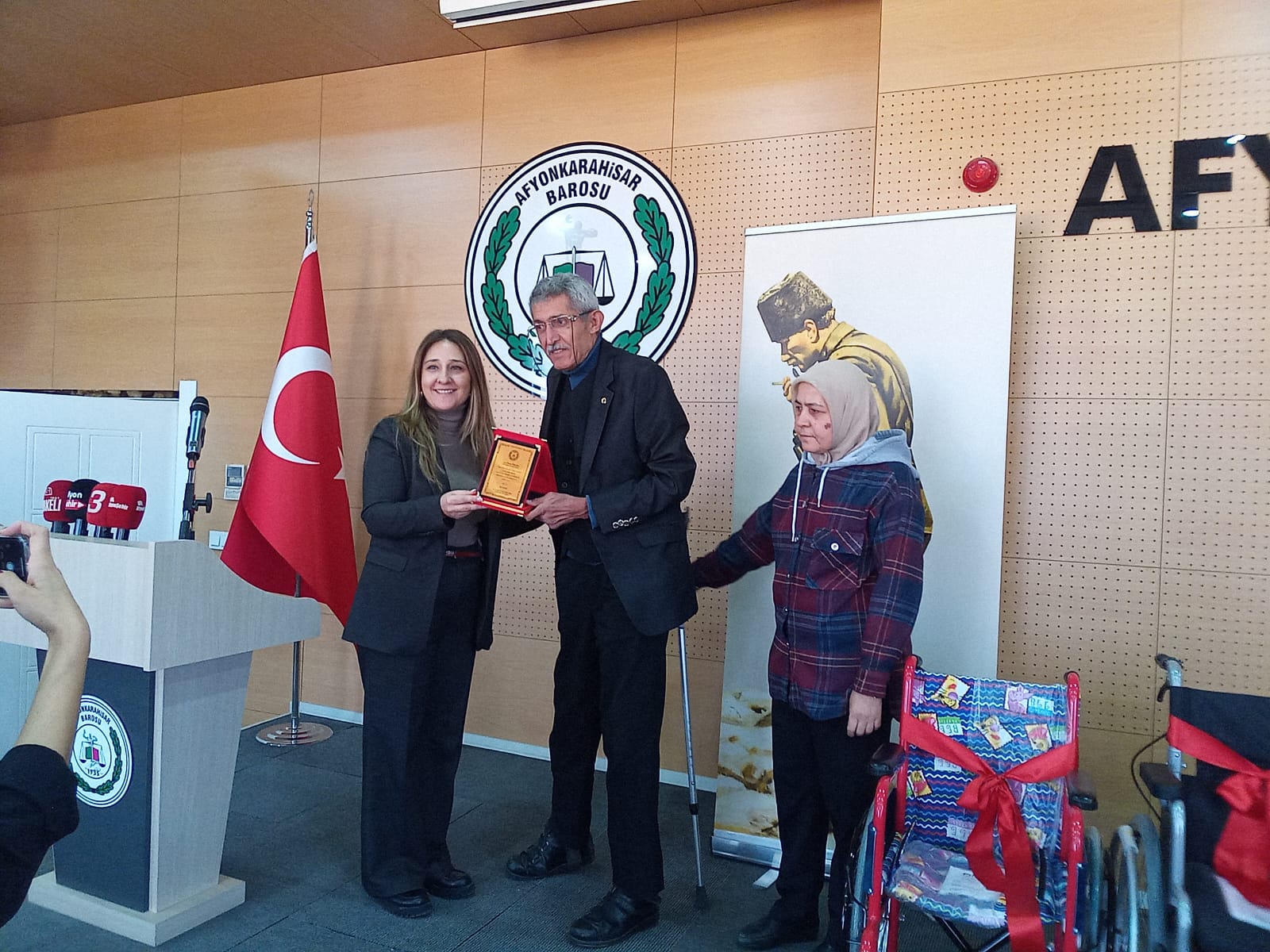 Biz Afyonkarahisar Barosu olarak her bir vatandaşımız ve meslektaşımız için üzerimize düşen yükümlülüklerin bilinci ile hareket ettiğimizi ve kamu adına her türlü destekte bulunacağımızı bir kez daha huzurlarınızda bildirerek “Engelli olmak sorun değil, engelliye engel olmak sorundur.” Söylemiyle hepinize teşekkür ediyorum. “ dedi. Daha sonra Türkiye Sakatlar Derneği Başkanı Faruk Özkara’ya plaket takdimi yapıldı, ardından tekerlekli sandalyeler, ihtiyaç sahiplerine dağıtıldı. Program verilen kokteyl ile sona erdirildi. Kaynak: AfyonTime