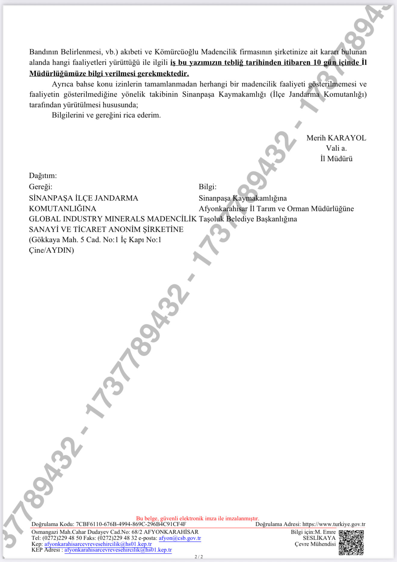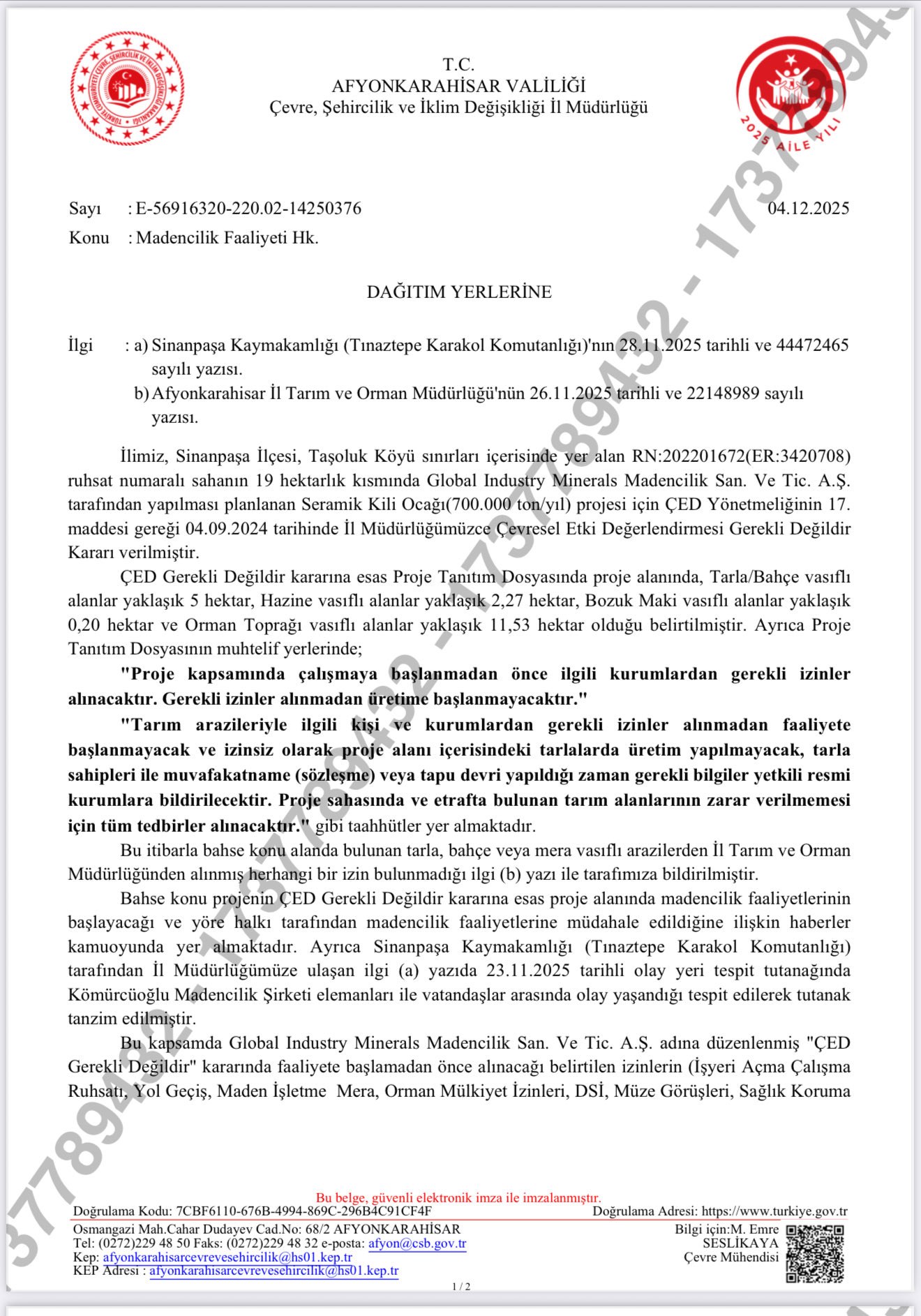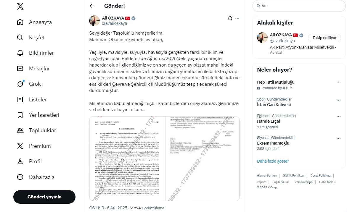 "Saygıdeğer Taşoluk’lu hemşerilerim, Mahmarı Obasının kıymetli evlatları, Yeşiliyle, mavisiyle, suyuyla, havasıyla gerçekten farklı bir iklim ve coğrafyası olan Beldemizde Ağustos/2025’deki yaşanan süreçte haberdar olup ilgilendiğimiz ve en son da geçen ay bizzat mahallindeki güvenlik sorunlarını sizler ve İl’imizin değerli yöneticileri ile birlikte çözüp o kepçe ve kamyonları gönderdiğimiz maden çıkarma sürecindeki hata ve eksiklikleri Çevre ve Şehircilik İl Müdürlüğümüz tespit ederek süreci durdurmuştur.