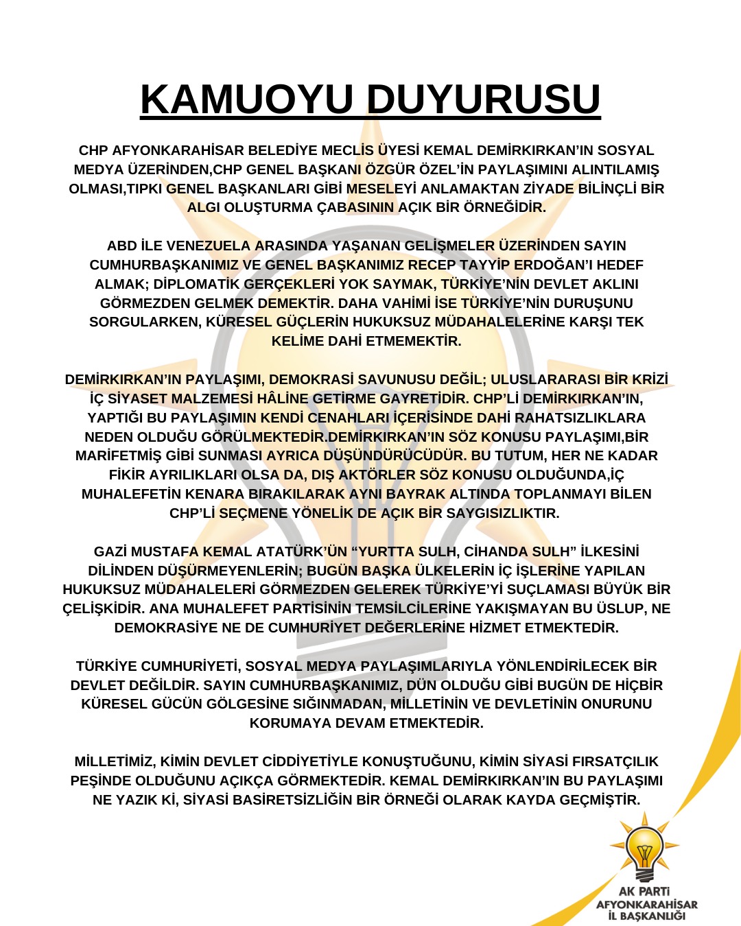 "CHP Afyonkarahisar Belediye Meclis Üyesi Kemal Demirkırkan’ın sosyal medya üzerinden,CHP Genel Başkanı Özgür Özel’in paylaşımını alıntılamış olması,tıpkı Genel Başkanları gibi meseleyi anlamaktan ziyade bilinçli bir algı oluşturma çabasının açık bir örneğidir.