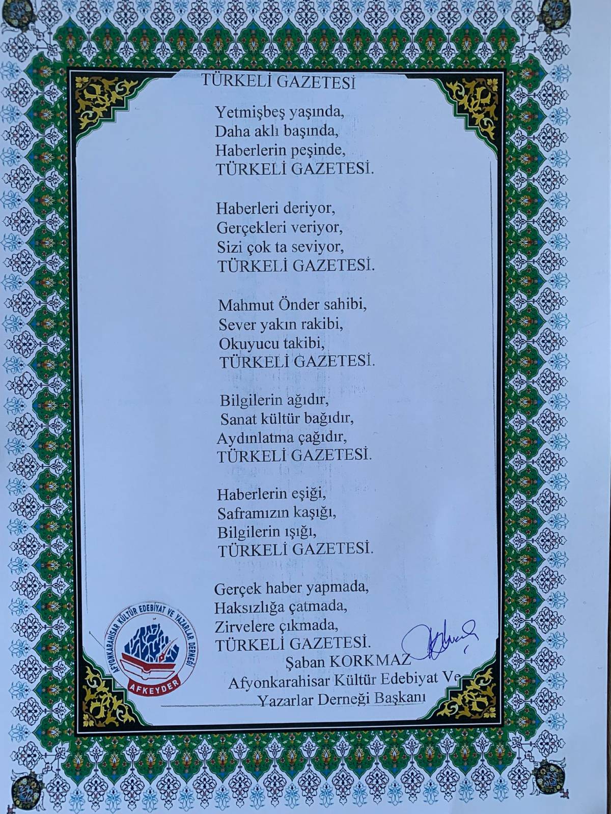 Görüşme kapsamında AFKEYDER Başkanı Şaban Korkmaz, Türkeli Gazetesi’nin bölge basınındaki yerine ve önemine değinerek, gazete adına kaleme aldığı özel şiiri Önder Artuk’a takdim etti.