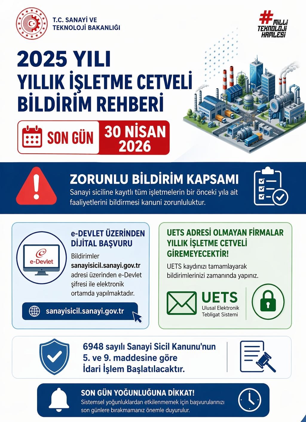 2025 yılına ait yıllık işletme cetveli için son giriş tarihi 30.04.2026 olup bu tarihten sonra giriş yapan ya da hiç giriş yapmayan işletmelere idari para cezası uygulanacaktır. Kaynak: Sanayi Teknoloji İl Müdürlüğü